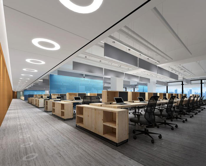 辦公室辦公區域設計:開放式的辦公區域,設計師采用加長版的辦公桌,在滿足辦公需求的同時,為企業打造人性化的辦公空間。