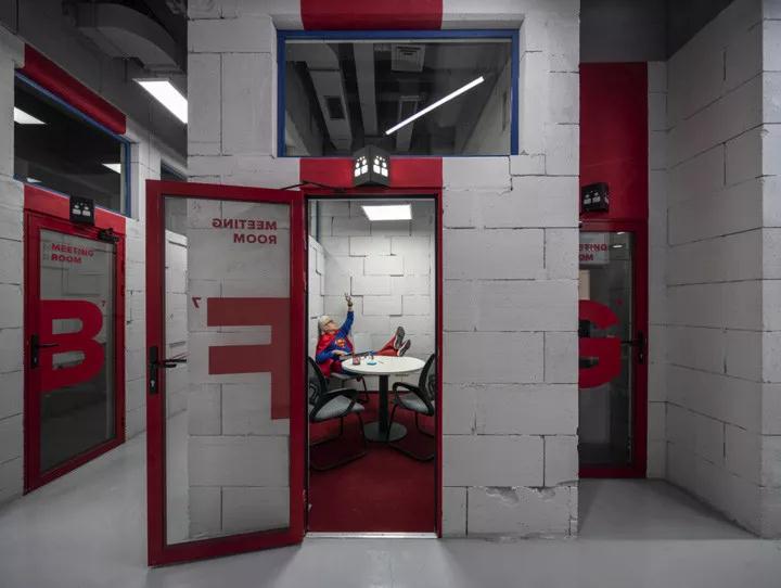 灰色環氧樹脂地坪漆、灰色的水泥墻面、灰色噴涂的頂面構造、以及灰色砌塊墻體,整個空間統一在寧靜的淺灰色調中,以紅色企業色來點亮一個個空間,賦予每個區域各自不同的劇情故事。