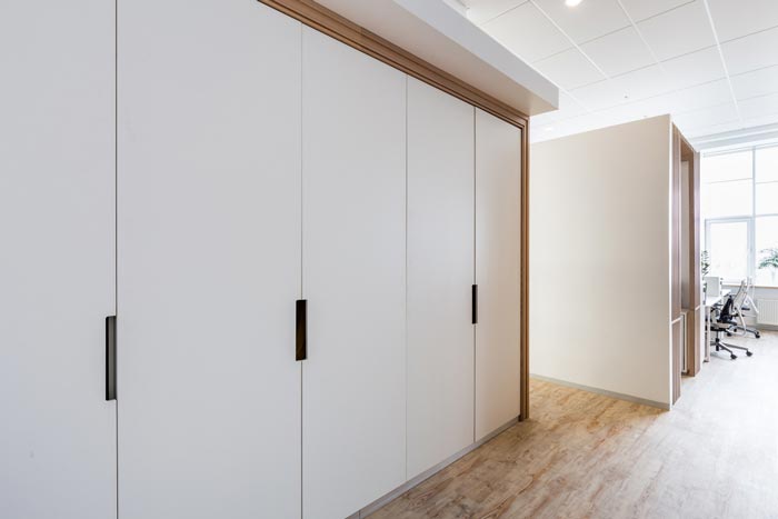 辦公室裝修設計工具間:設計師舍棄了一個工位,將其打造成工具間,這樣設計的好處就是在不影響格局的前提下,將每一個區域都安排的恰如其分,同時此處也位于空間的中央,在無形上提升了工作的效率,設計師需要做的就是在滿足需求的同時,并逐漸優化、細化設計。