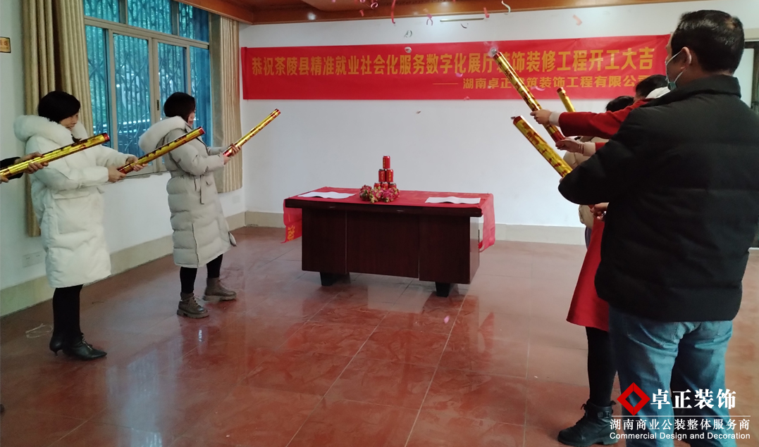 該數字展廳裝修工程項目是湖南卓正裝飾公司為茶林縣精準就業社會化服務數字化展廳空間從設計、消防、施工一站式整裝工程,根據中國傳統文化選擇黃道吉日已于日前開工,值此春風拂柳,萬物復蘇的良辰美景之時,湖南卓正裝飾感謝茶林縣精準就業社會化服務展廳公司對我們的信任支持,并熱烈祝賀茶林縣精準就業社會化服務數字化展廳裝飾裝修工程開工大吉,預祝項目工程完滿峻工!